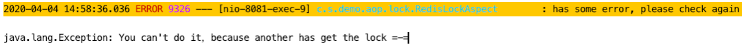 2020-04-04 14:55:54.851 INFO 9326 --- [k-schedule-pool] c.s.demo.aop.lock.RedisLockAspect : businessKey : [Business1:1024], try count : 1