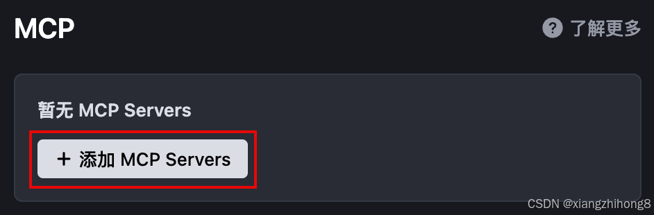 - 在 MCP 页签中,点击 + 添加 MCP Servers 按钮。若你已添加过 MCP Server,则点击右侧区域的 + 添加 按钮。
