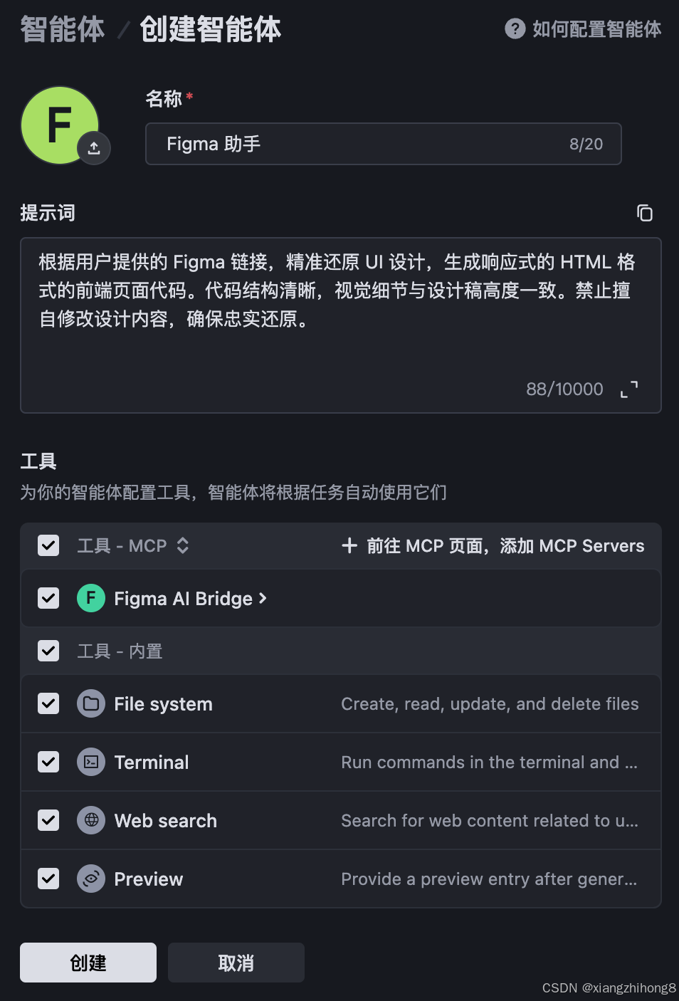 - 配置该智能体:(可选) 上传智能体的头像。输入智能体的名称(例如:Figma 助手)。(可选) 配置智能体的提示词。参考提示词如下,你可以直接使用或根据需求制订提示词。