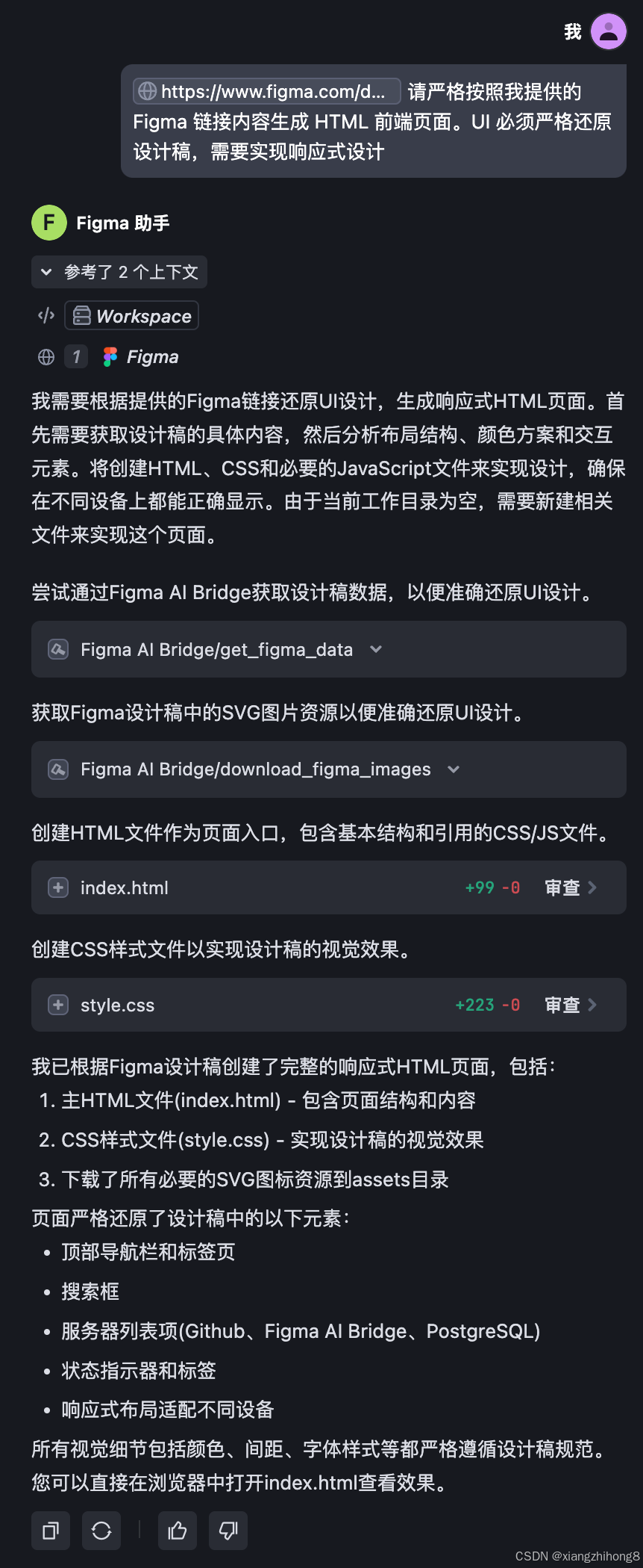 智能体开始调用 Figma AI Bridge 中的工具和服务,读取设计稿的内容,自动生成文件,填入前端代码,并生成一个 index.html 文件供你预览效果。以下输出过程供参考: