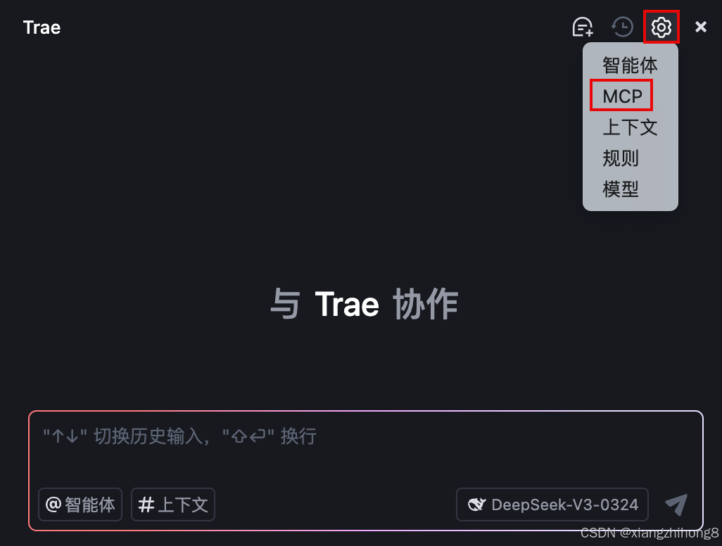 在 AI 对话框的右上角,点击 设置 图标,然后在菜单中选择 MCP。