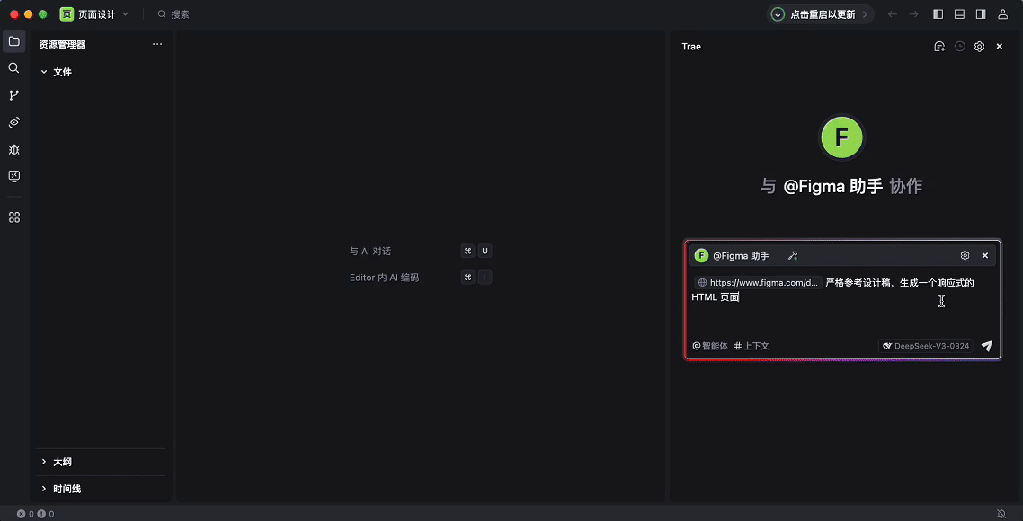 在上一环节中,点击 立即使用 按钮后,Trae IDE 会将你引导至 AI 对话框,并默认选用 Figma 助手 智能体(若未创建自定义智能体,则使用 Builder with MCP)。你可以与该智能体对话,输入 Figma 设计稿的地址,然后描述你的需求,让智能体创建相应的前端页面。