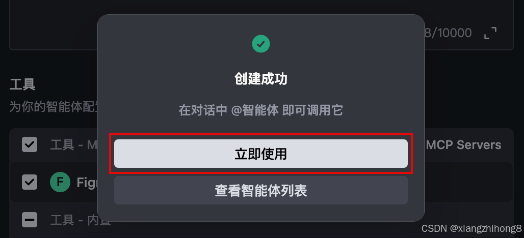配置了 Figma AI Bridge 的智能体创建成功。你可以点击 立即使用 按钮,开启与智能体的对话。