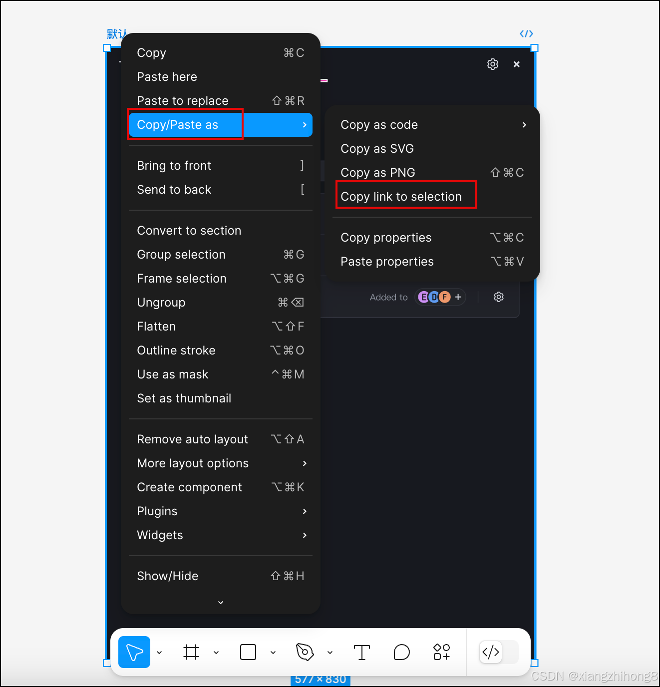 前往 Figma 设计稿页面,选中设计稿并右击,然后在菜单中选择 Copy/Paste as > Copy link to selection。