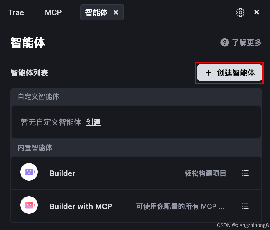 - 点击右侧区域的 + 创建智能体 按钮。