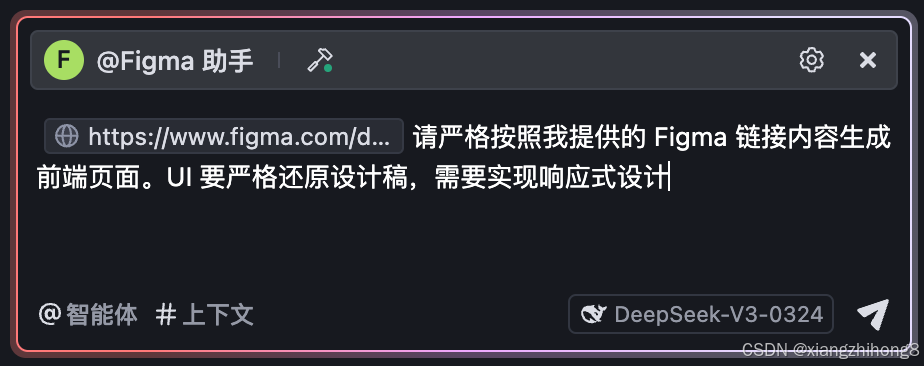 在设计稿链接的标签后输入你的需求并发送。例如:"请严格按照我提供的 Figma 链接内容生成 HTML 前端页面。UI 要严格还原设计稿,需要实现响应式设计"。
